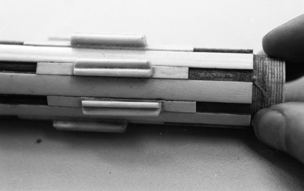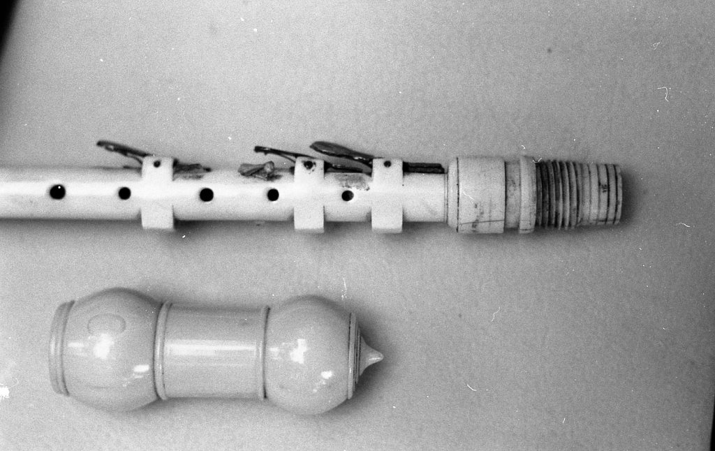 I had a chance to briefly study this instrument in 1999 when it was in the possession of a friend. I don’t know its current whereabouts. It is made of Ivory, well turned as you would expect from an instrument made for a wealthy client. and probably dates to the late 1600s. I was able to make several x-rays of the instrument with the help of a friendly local chiropractor, and these are included below. These x-rays showed several interesting things about this instrument is that visual inspection did not: